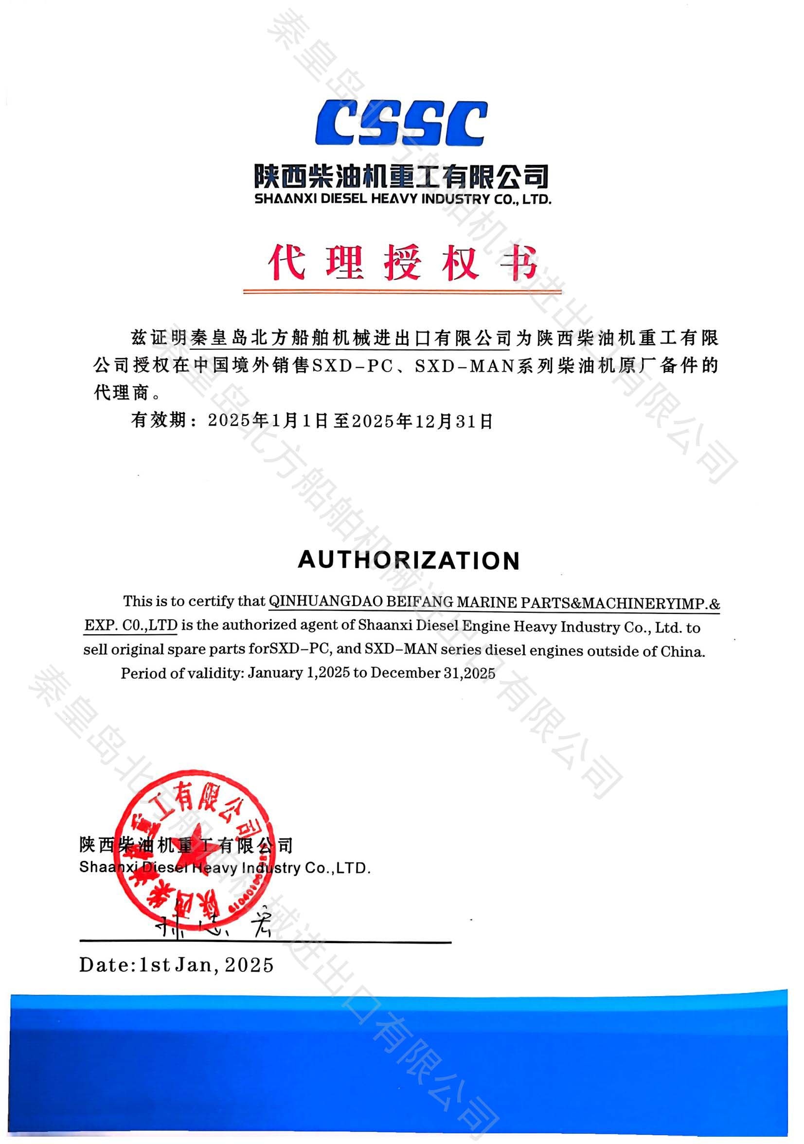 Qinhuangdao Beifang Marine Parts & Machinery Import & Export Co., Ltd. is an authorized agent of Shaanxi Diesel Heavy Industry. We agent the original spare parts for the SXD-PC and SXD-MAN series diesel engines.